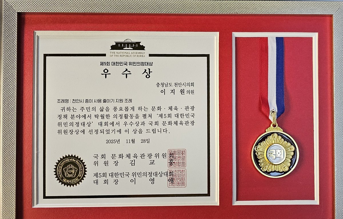 [충청중심뉴스] 천안시의회 이지원 의원이 대표발의한 「천안시 종이 사용 줄이기 지원 조례」가 혁신성과 공익성을 인정받아 금일 국회 도서관에서 열린 ‘제5회 대한민국 위민의정대상’시상식에서 우수상을 수상했다.