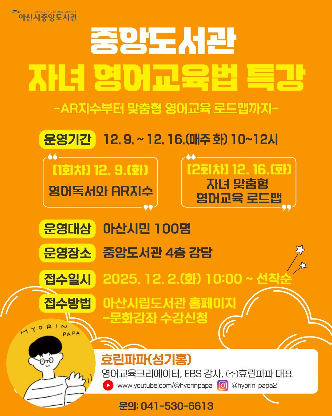 [충청중심뉴스] 아산시 중앙도서관은 오는 12월 9일과 16일, 두 차례에 걸쳐 영어교육 전문가 효린파파와 함께하는 자녀 영어교육법 특강을 운영한다.