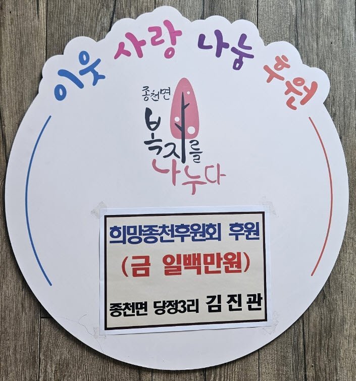 김병찬 희망종천후원회장은“오랫동안 변함없이 후원해 주시는 김진관 님은 지역사회에 귀감이 되고 있다”“후원금은 관내 어려운 이웃을 위해 소중하게 사용하겠다”고 전했다.