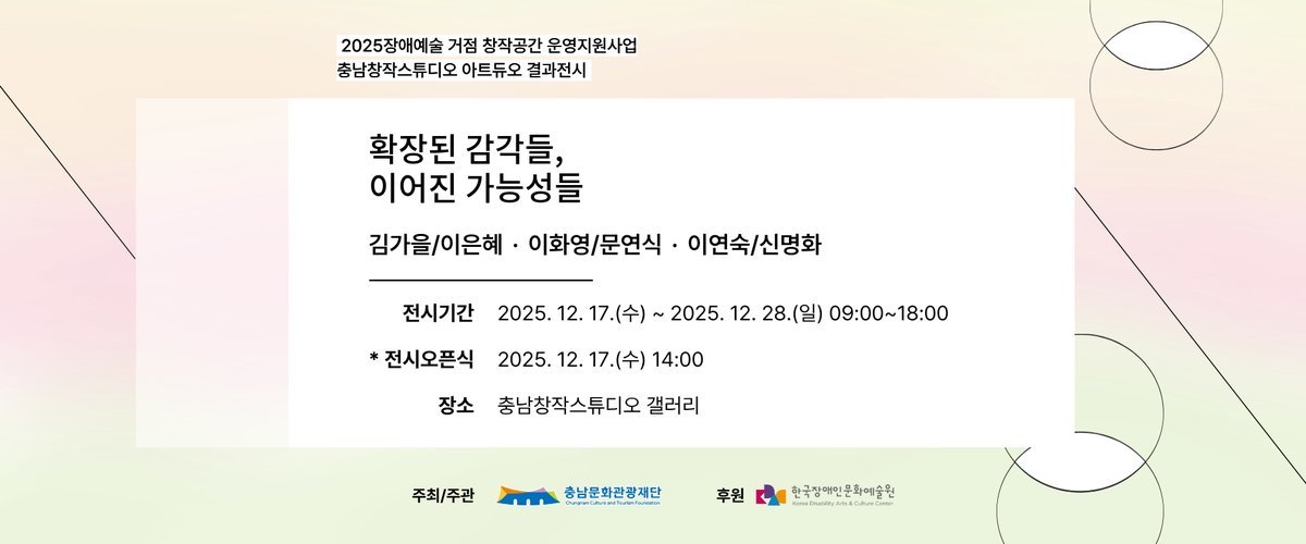 [충청중심뉴스] 충남문화관광재단은 「2025 장애예술 거점 창작공간 운영 지원사업」의 성과 확산과 장애예술 인식 제고를 위해 2025년 12월 17일부터 28일까지 충남 태안군 충남창작스튜디오 갤러리에서 「확장된 감각들, 이어진 가능성들」 아트듀오 결과전시회를 개최한다.