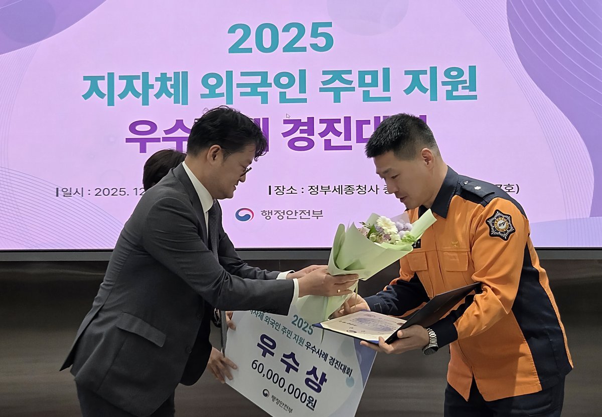 [충청중심뉴스] 대전동부소방서는 1일 정부세종청사에서 열린 「2025년 지자체 외국인주민 지원 우수사례 경진대회」에서 대전시 대표로 출전한 ‘외국인 주민과 함께하는 119안전라이프+’가 행정안전부 장관상인 우수상을 수상했다.