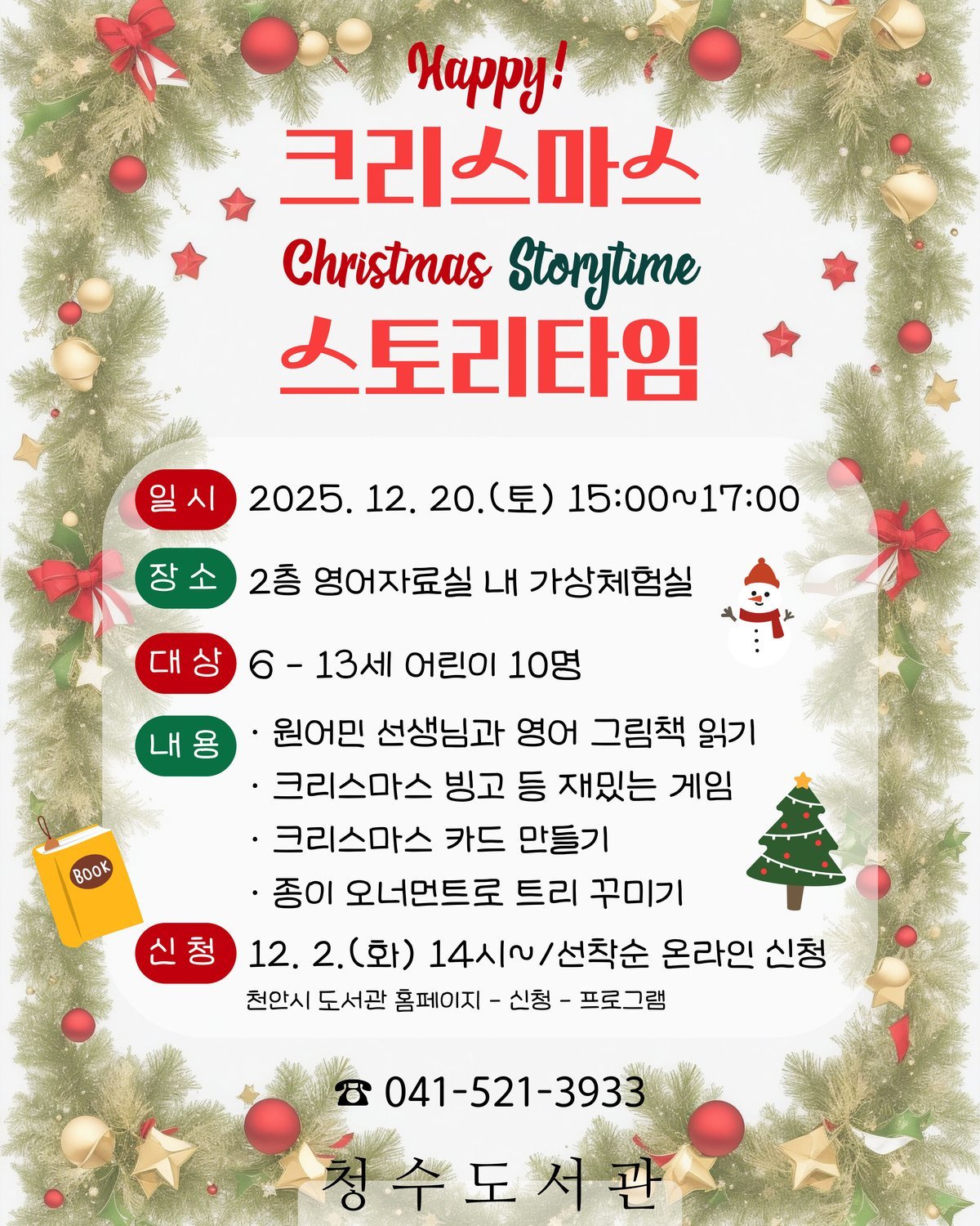 [충청중심뉴스] 천안시 청수도서관은 오는 20일 ‘해피 크리스마스 스토리타임’ 프로그램을 운영한다고 2일 밝혔다.