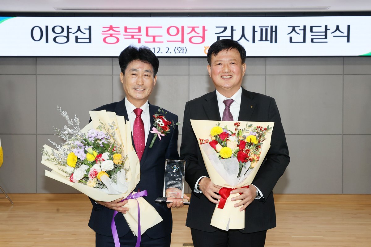 [충청중심뉴스] 충북도의회 이양섭 의장이 2일 농업 발전과 농업인 실익 증대에 기여한 공로로 농협중앙회장 감사패를 받았다.
