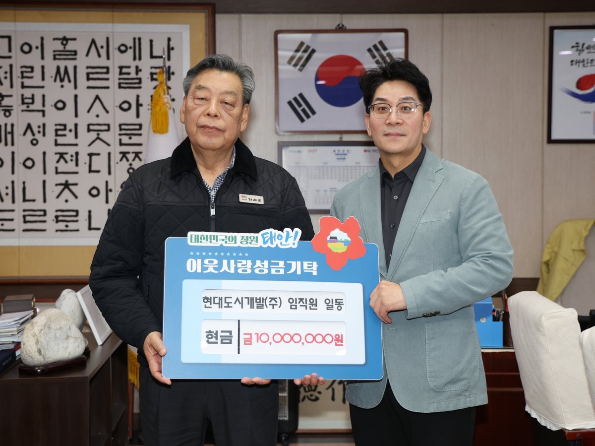 군에 따르면 현대도시개발는 지난 2일 군청 군수실에서 가세로 군수와 백정욱 대표 등이 참석한 가운데 기탁식을 갖고 1천만 원의 성금을 군에 기탁했다.