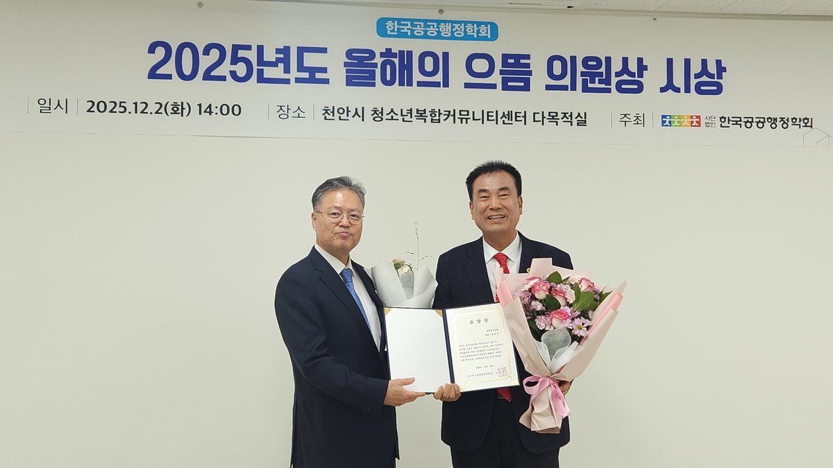 [충청중심뉴스] 방한일 충남도의원이 2일 한국공공행정학회가 선정한 ‘2025 올해의 으뜸 의원상’을 수상했다.
