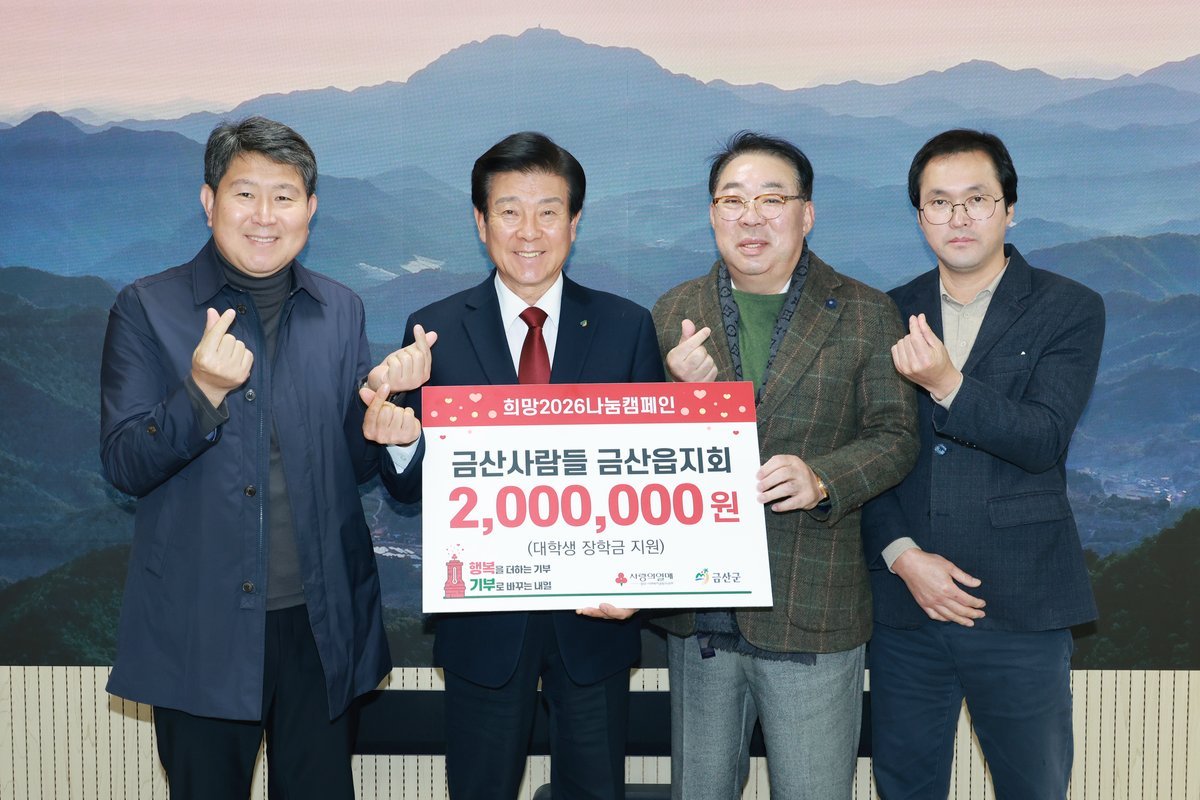 군 관계자는 “어려운 이웃을 돕는 금산사람들 급산읍지회 회원들의 따뜻한 마음에 깊이 감사드린다”며 “전달된 장학금은 학생들의 학업 지원에 소중하게 사용될 것”이라고 말했다.