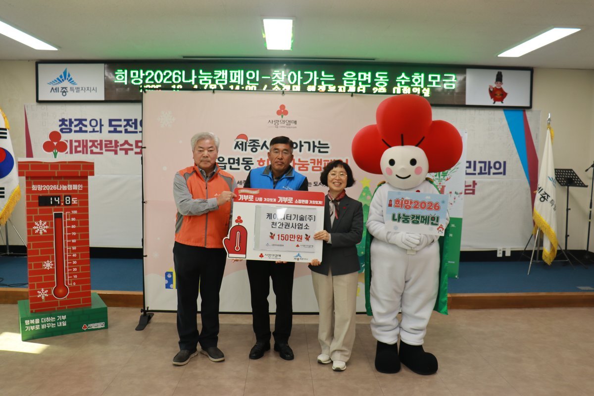 [충청중심뉴스] 세종특별자치시 소정면이 지난 4일 열린 ‘2026년 희망나눔 캠페인 찾아가는 읍면동 순회모금’ 행사에서 케이워터기술㈜천안권사업소가 150만 원을 기부했다고 밝혔다.