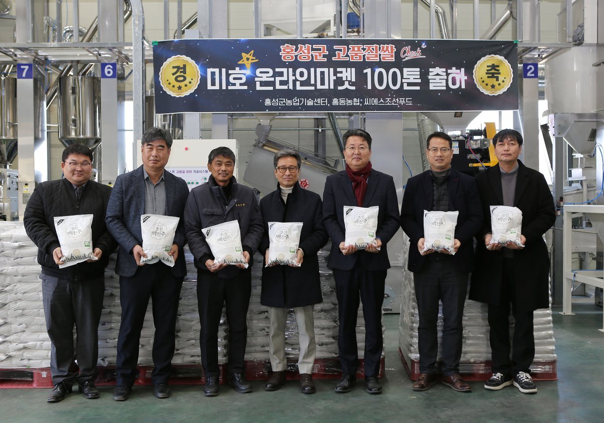 [충청중심뉴스] 홍성군 농업기술센터는 지난 4일 홍동농협 미곡처리장에서 ‘미호벼 온라인마켓 100톤 출하 기념식’을 개최했다. 이번 성과는 홍성군농업기술센터–홍동농협–씨에스조선푸드 간 협력 구조를 통해 달성된 것으로, 농산물 생산–가공·유통–온라인 판매까지 연계한 대표적인 협업 모델로 평가받는다.