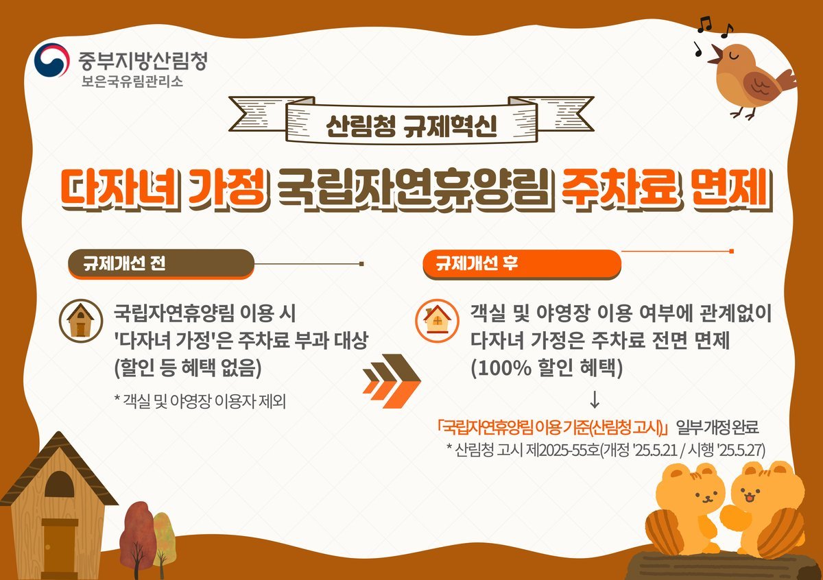 이에 따라, 산림청에서는「국립자연휴양림 이용 기준」을 일부 개정하여 객실 및 야영장 이용 여부와 관계없이 다자녀 가정은 주차료를 전면 면제받는 혜택을 누릴 수 있게 되었다.