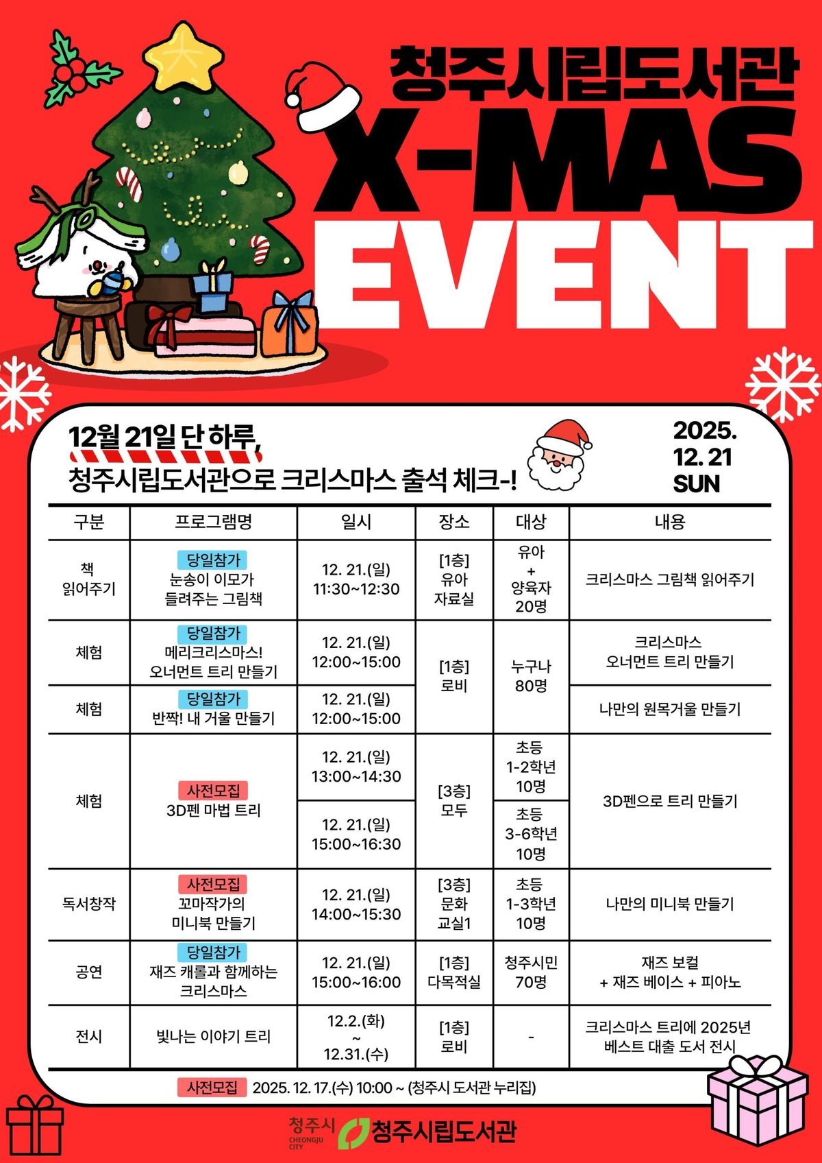 세부 내용으로는 △공연‘재즈 캐롤과 함께하는 크리스마스’△어린이 현장 참여 체험부스 ‘크리스마스 오너먼트 트리만들기’, ‘나만의 원목 거울 만들기’△유아 대상 책읽기 ‘눈송이 이모가 들려주는 그림책’△어린이 대상 ‘미니북 만들기’, ‘3D펜으로 마법트리 만들기’등이 운영된다.