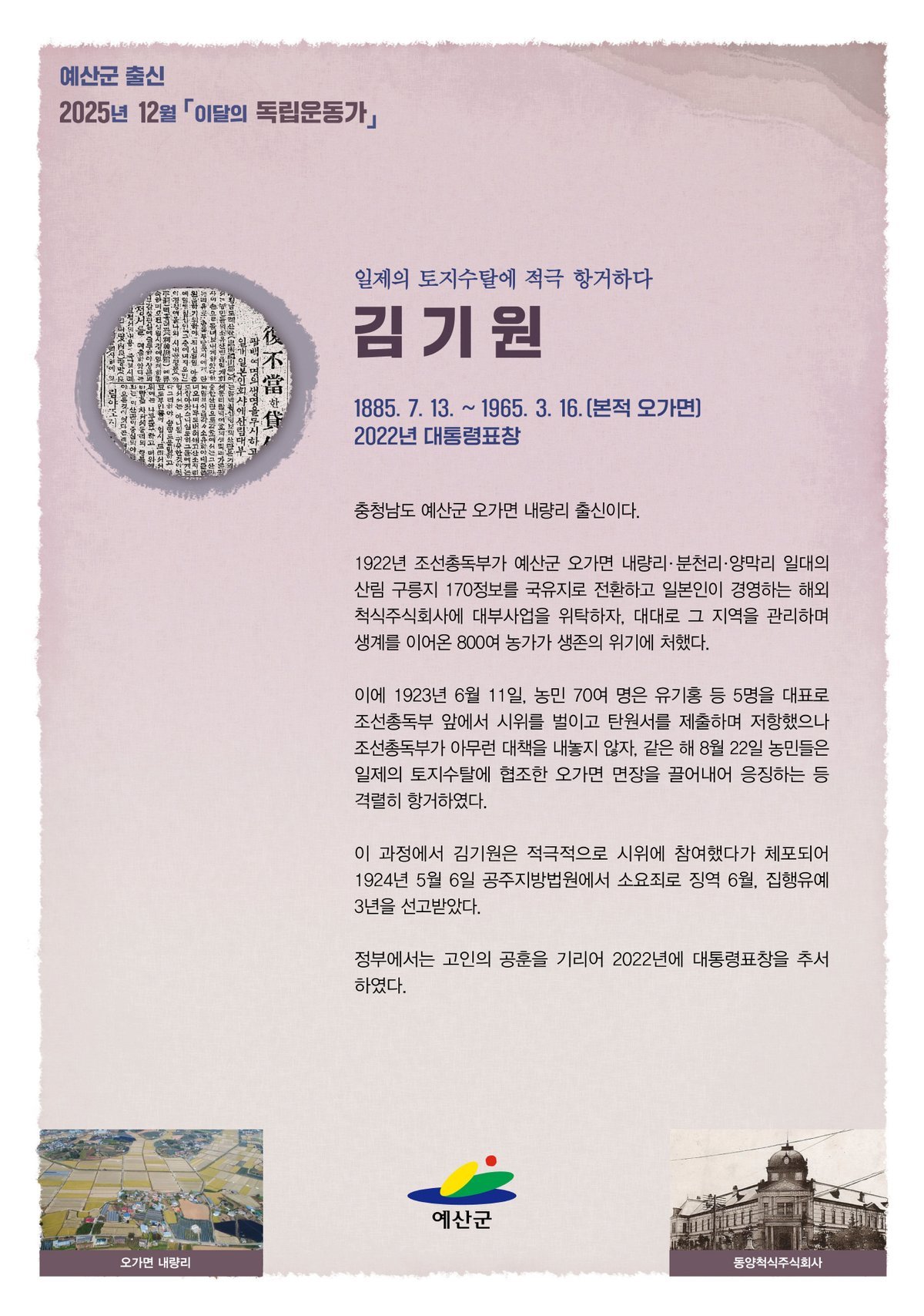 [충청중심뉴스] 예산군은 오가면 내량리 출신 김기원 선생을 2025년 12월 ‘이달의 독립운동가’로 선정했다고 밝혔다.