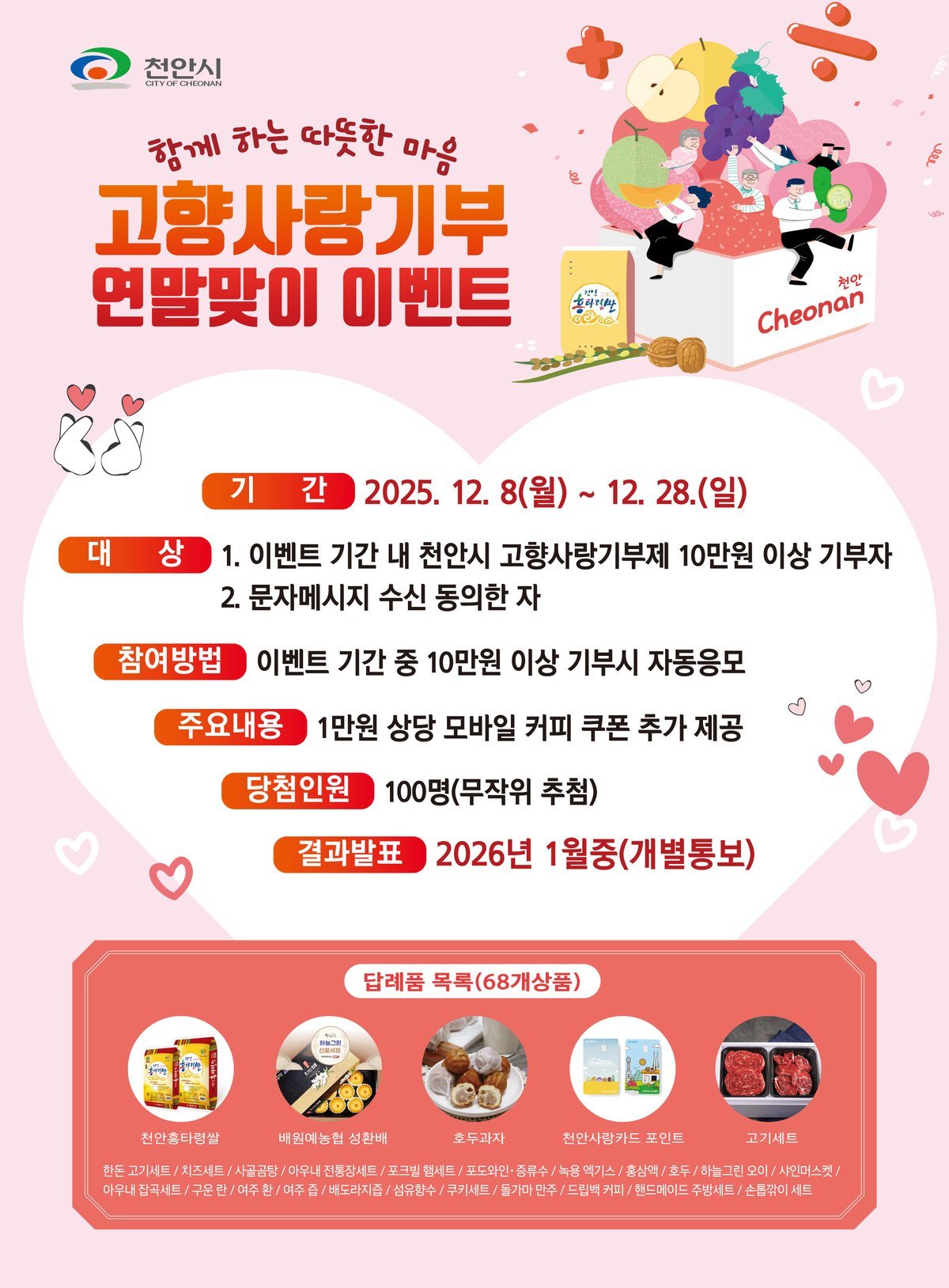 [충청중심뉴스] 천안시는 오는 28일까지 ‘고향사랑기부제 연말맞이 이벤트’를 진행한다고 8일 밝혔다.