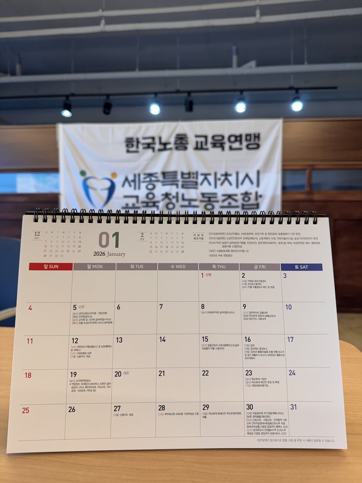 오창영 위원장은 “학교 현장에서 필요로 하는 실무 정보를 정확하게 제공하고 행정 부담을 덜어드리는 것이 노동조합의 중요한 역할.”이라며, “교육청과 협력하여 제작한 2026년 업무달력이 학교 구성원들의 업무 효율성을 높이는 데 도움이 되기를 바란다.”라고 말했다.