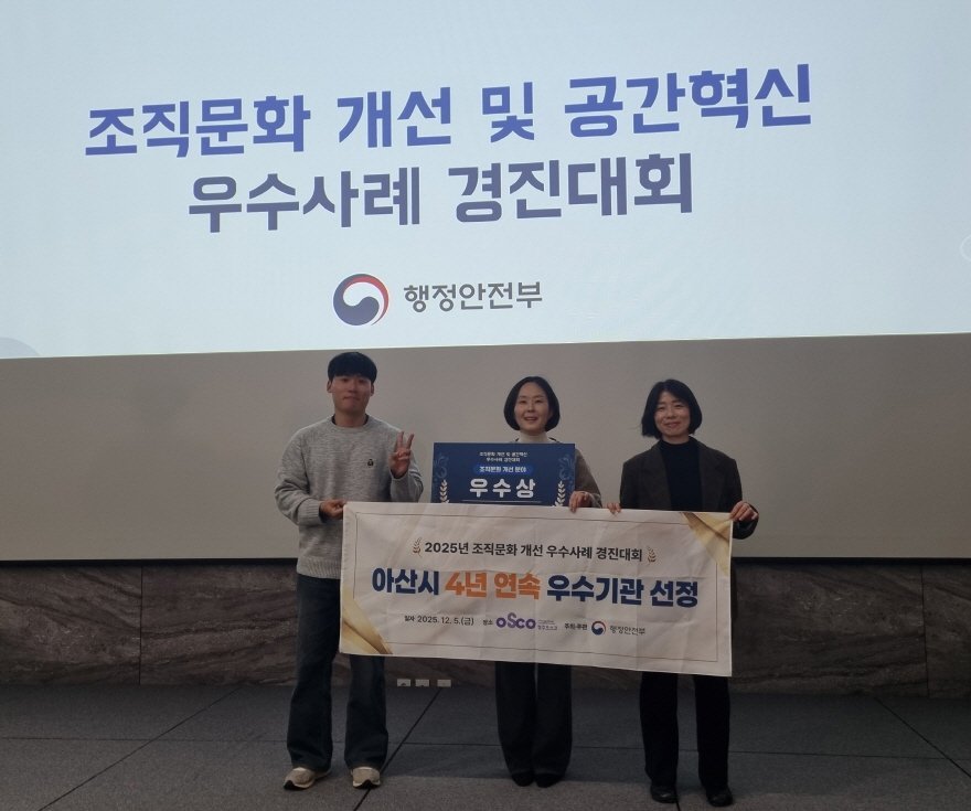 [충청중심뉴스] 아산시는 5일 청주 오송컨벤션센터에서 열린 행정안전부 주관 ‘2025년 조직문화 개선 우수사례 경진대회’에서 우수상을 수상했다.