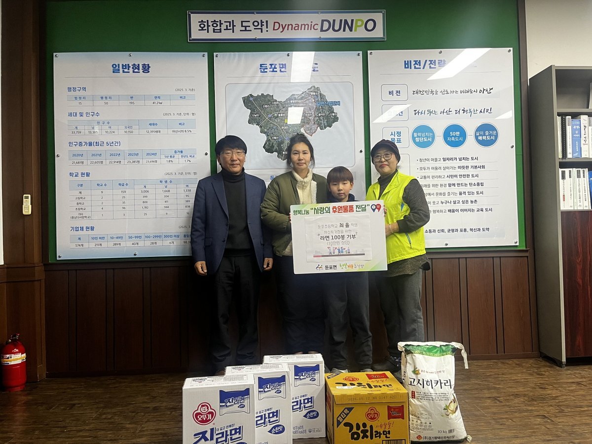[충청중심뉴스] 아산시 둔포면 행정복지센터에 둔포초등학교 5학년 최율 어린이가 15만 원 상당의 쌀과 라면을 기부하여 지역사회에 따뜻한 나눔을 실천했다.