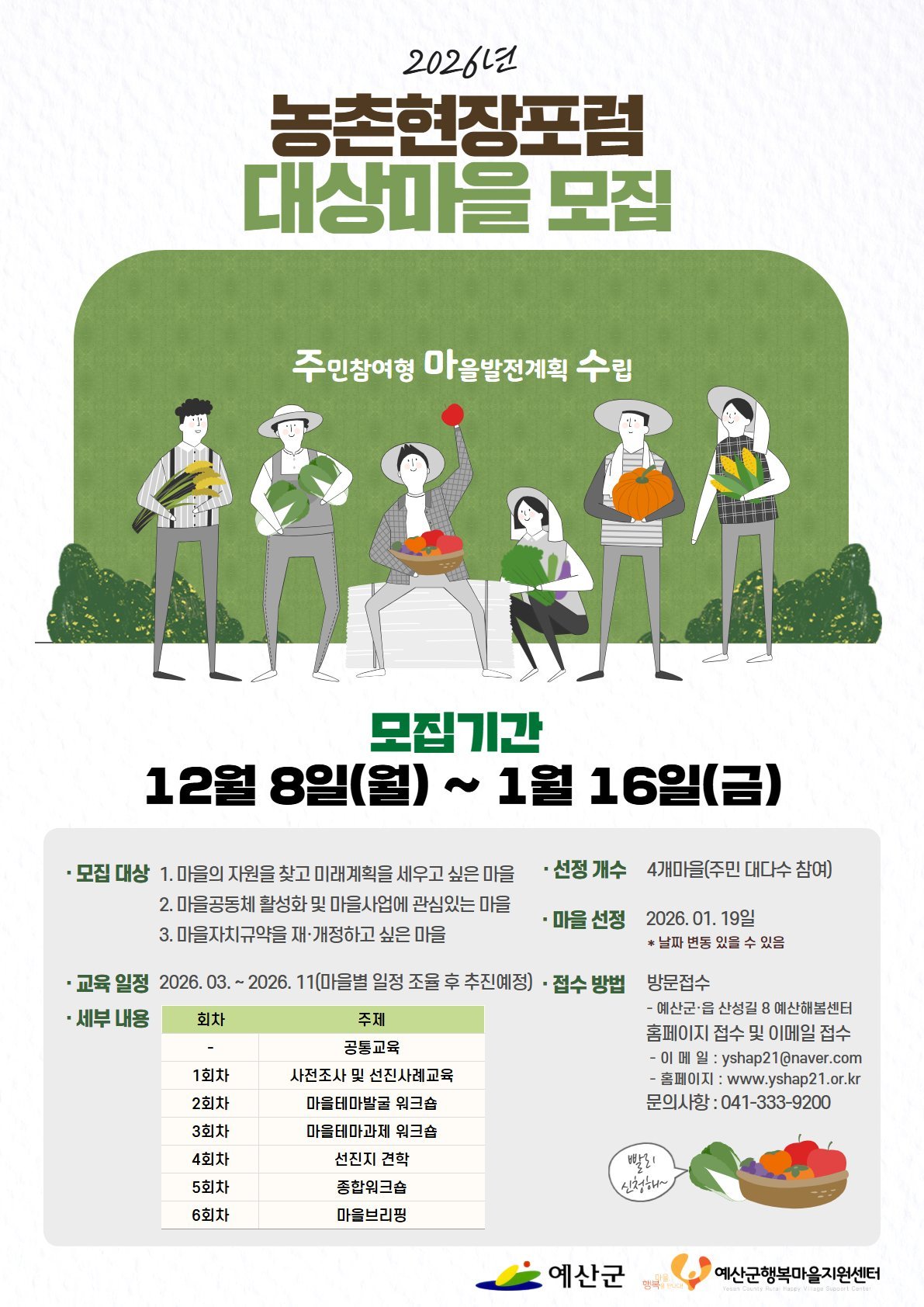 [충청중심뉴스] 예산군과 예산군행복마을지원센터는 2026년 주민주도 마을발전계획수립에 참여할 대상마을을 내년 1월 16일까지 모집한다고 밝혔다.