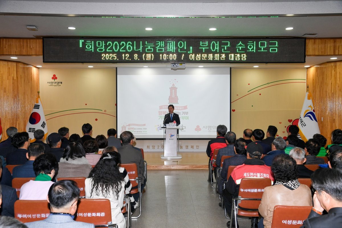 [충청중심뉴스] 부여군 은 ‘행복을 더하는 기부, 기부로 바꾸는 부여 ’라는 구호 아래 「 희망 2026 나눔 캠페인 」 순회 모금 행사를 지난 8일 여성문화회관 3층 대강당에서 개최했다.