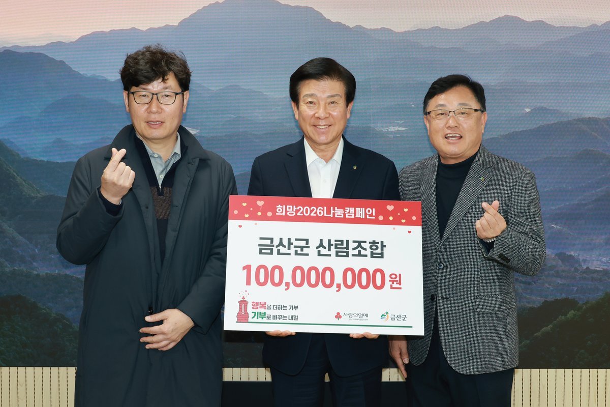 [충청중심뉴스] 금산군산림조합은 지난 9일 금산군청을 방문해 2026 희망나눔캠페인 성금 1억 원을 기탁하며 지역사회 나눔 실천에 앞장섰다.