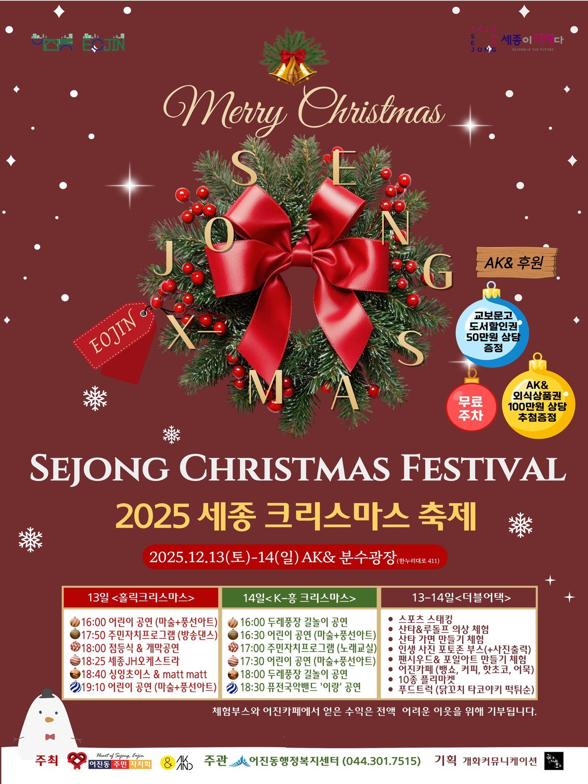 [충청중심뉴스] 세종특별자치시 어진동과 주민자치회가 오는 13∼14일 AK& 세종에서 ‘2025 세종 크리스마스 축제’를 진행한다.