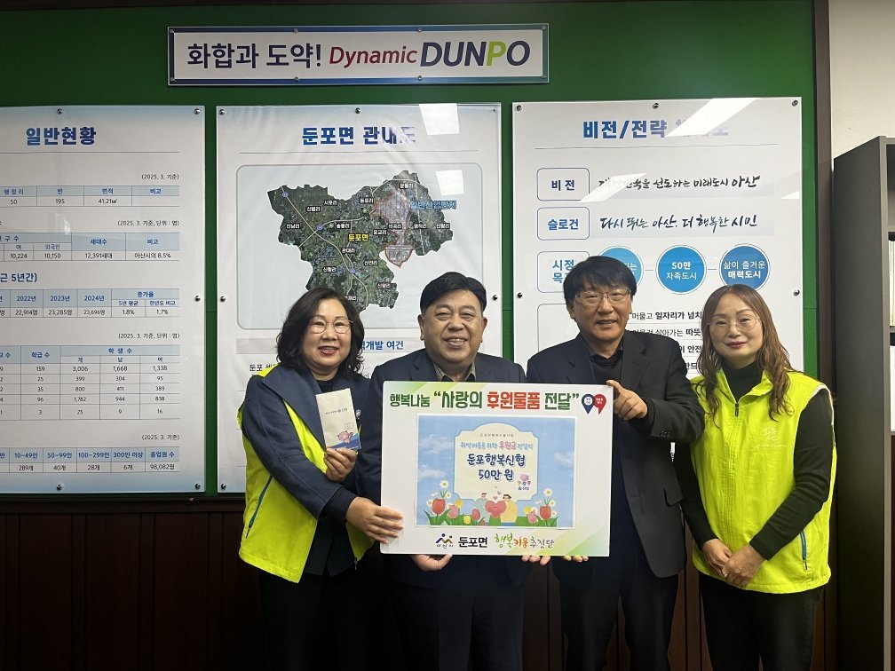 이모완 둔포면장은 “지속적인 관심과 나눔을 실천해 주셔서 감사드린다”며 “필요한 주민들에게 도움이 정확히 전달되도록 노력하겠다”고 말했다.
