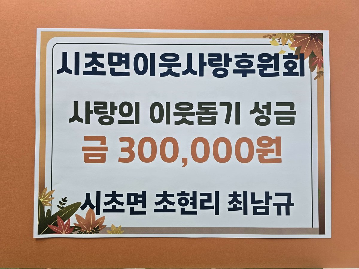 [충청중심뉴스] 시초면 초현리 주민 최남규 씨가 지난 10일 지역의 어려운 이웃을 돕기 위해 시초면이웃사랑후원회에 성금 30만원을 기탁했다..최남규 씨는 “크지 않은 마음이지만 주변의 어려운 분들께 작은 보탬이 되었으면 한다”고 전했다.
