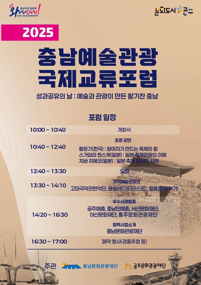 [충청중심뉴스] 충남문화관광재단은 공주문화관광재단과 공동으로 12일 오전 10시, 충남에서 활동하는 예술인과 관광 실무자, 국내외 전문가들이 함께하는 ‘2025 충남 예술관광 국제교류 포럼’을 개최한다고 밝혔다.