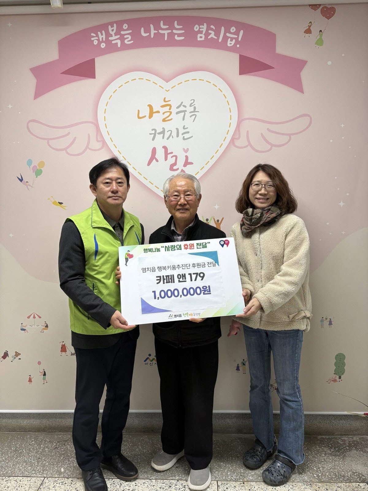 [충청중심뉴스] 아산시 염치읍에 위치한 카페앤179은 지난 15일 염치읍 행정복지센터에서 염치읍 행복키움추진단에 후원금 100만 원을 전달하며 지역사회 이웃사랑 실천에 동참했다.
