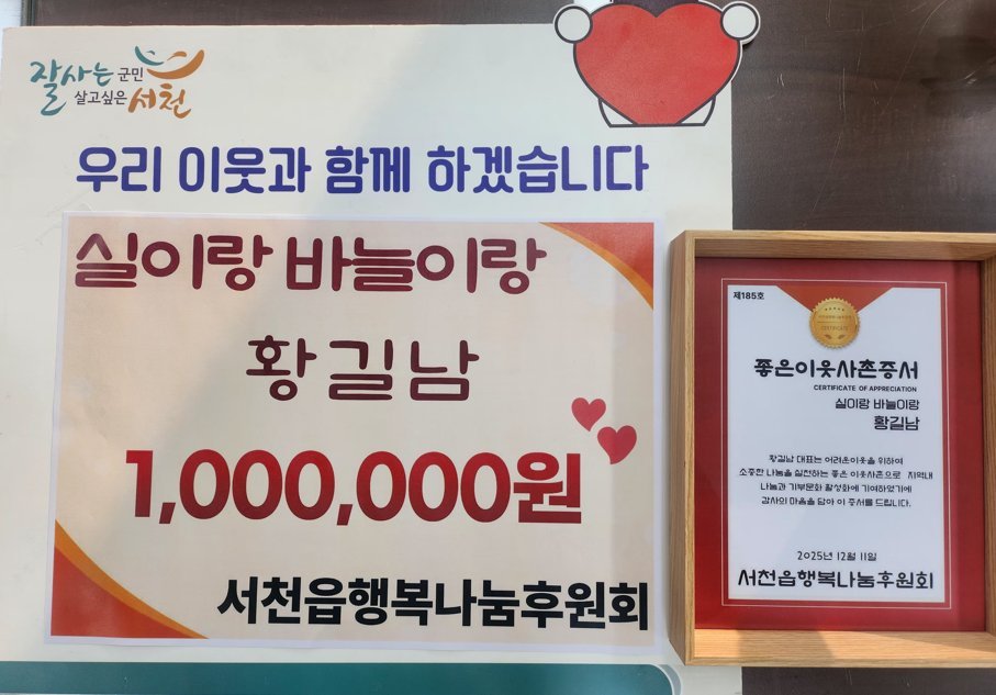 [충청중심뉴스] ‘실이랑 바늘이랑’의 황길남 대표는 지난 16일 서천읍행복나눔후원회에 후원금 100만원을 기탁하며 연말 이웃사랑을 실천했다.