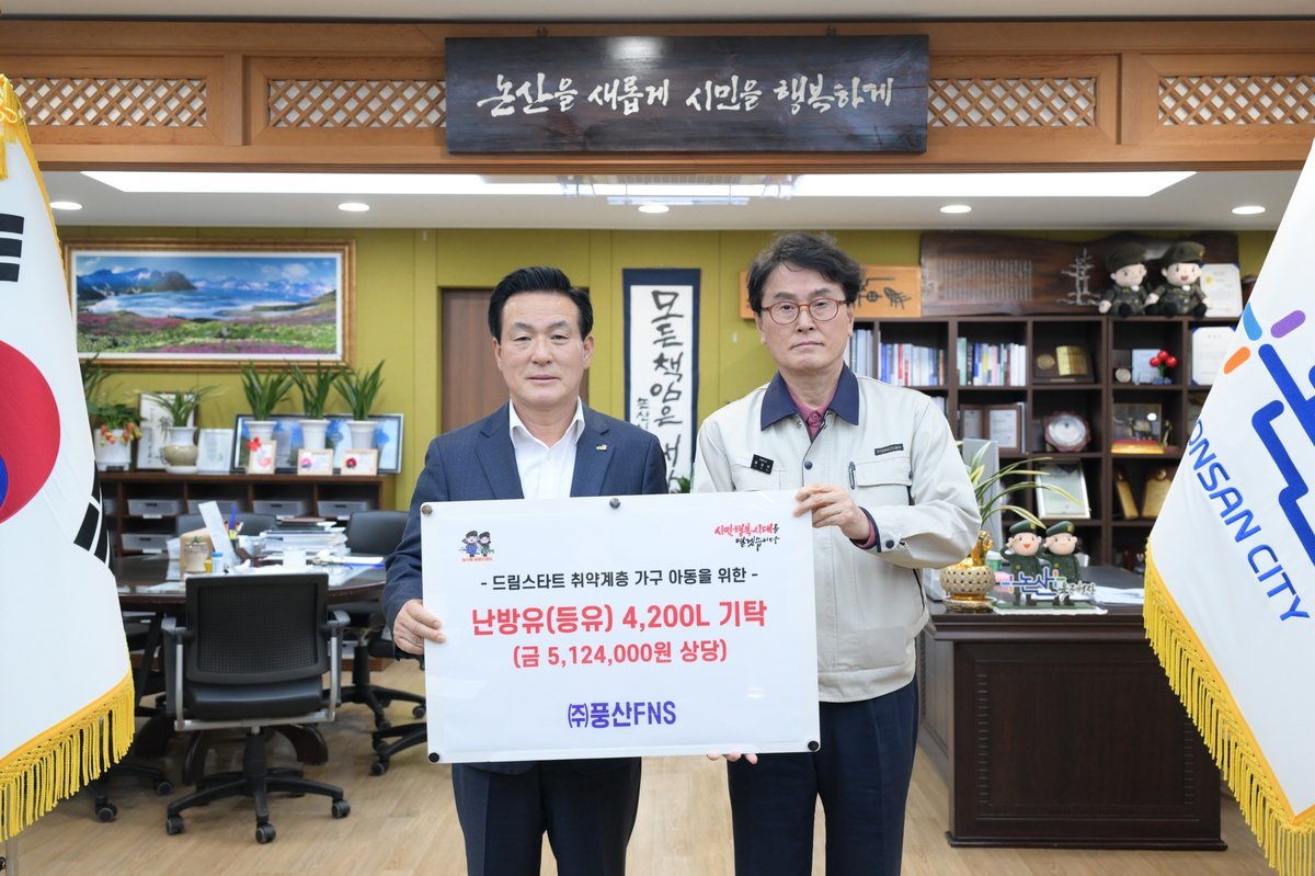[충청중심뉴스] 논산시는 15일 국방산업 전문기업 ㈜풍산FNS가 저소득 아동들을 위해 약 500만 원 상당의 등유 4200리터를 기탁했다고 밝혔다.