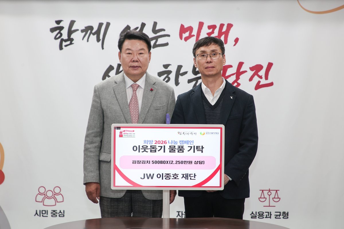 이날 JW 이종호 재단은 지역 내 취약계층의 따뜻한 겨울나기를 지원하기 위해 김장김치 500상자를 당진시복지재단에 기탁했다.