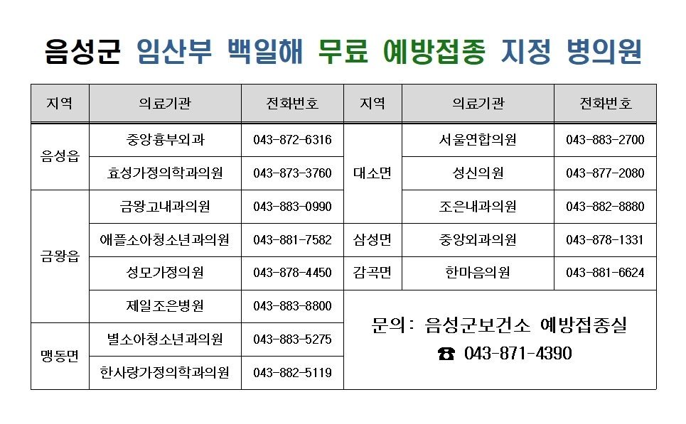 이번 조례 제정으로 2026년 1월부터 음성군에 주민등록을 둔 임산부와 돌봄 가족을 대상으로 백일해 무료 예방접종이 시행된다.
