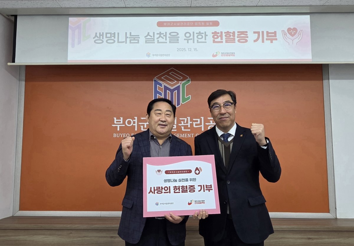 [충청중심뉴스] 부여군시설관리공단은 임직원들이 자발적으로 모은 헌혈증 84매를 대한산업보건협회 한마음혈액원에 기부하며 지역사회 생명 나눔 활동에 동참했다고 18일 밝혔다.