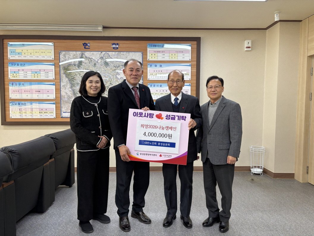 [충청중심뉴스] 대한노인회 홍성읍분회는 지난 17일 홍성읍 행정복지센터를 방문해 ‘희망2026 이웃돕기 성금’으로 400만 원을 기탁하며 지역사회에 따뜻한 나눔을 실천했다.
