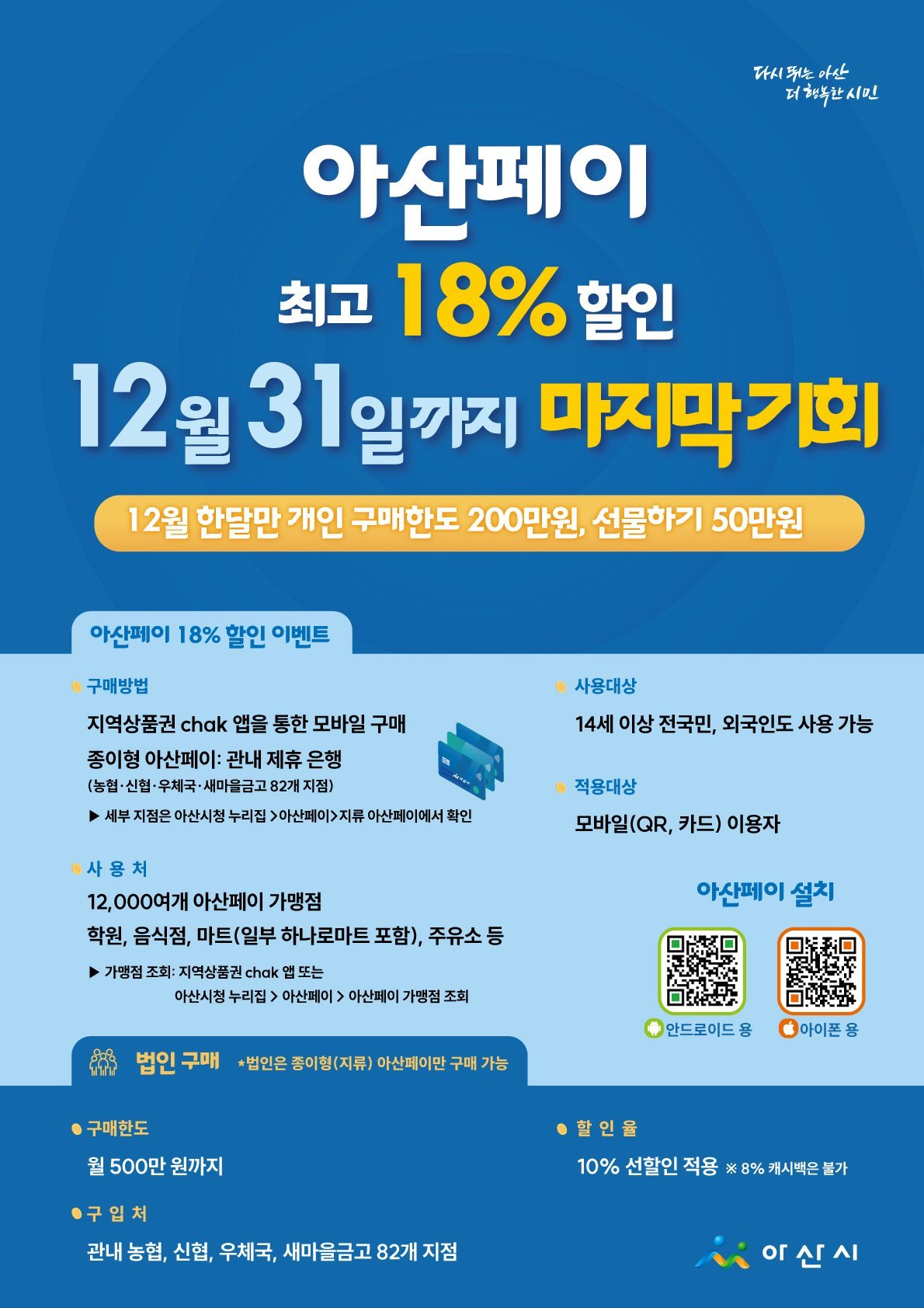 아산시는 시민 체감도를 높이기 위해 연말까지 아산페이 할인 혜택을 집중 운영하고 있다.