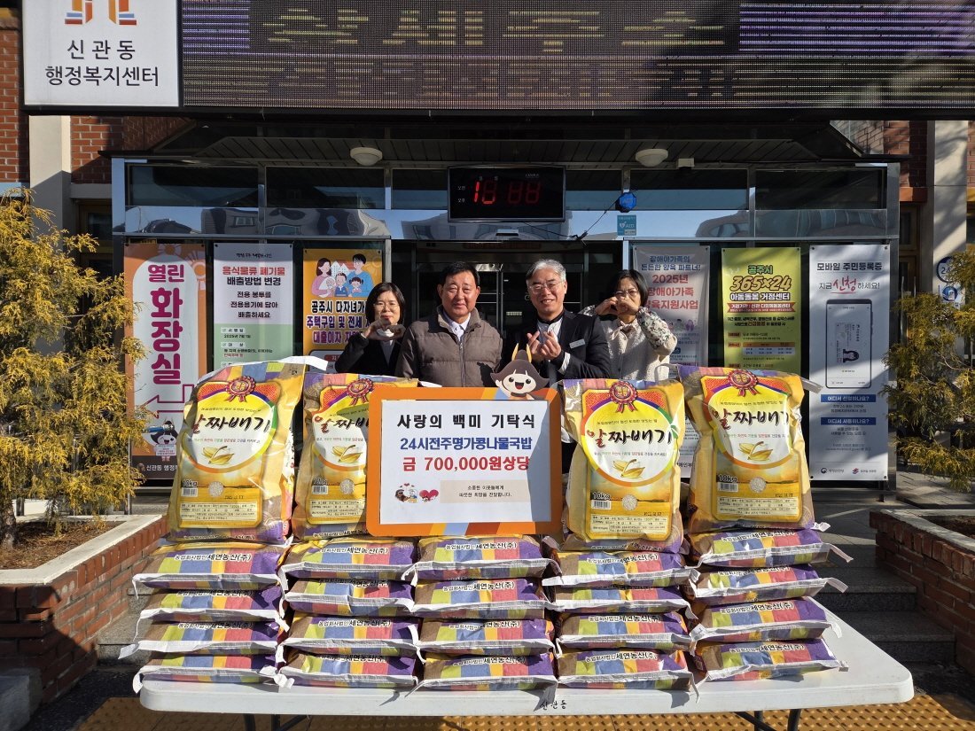 [충청중심뉴스] 공주시 신관동은 24시전주명가콩나물국밥이 지난 18일 취약계층을 위한 ‘사랑의 백미’를 기탁했다고 밝혔다.