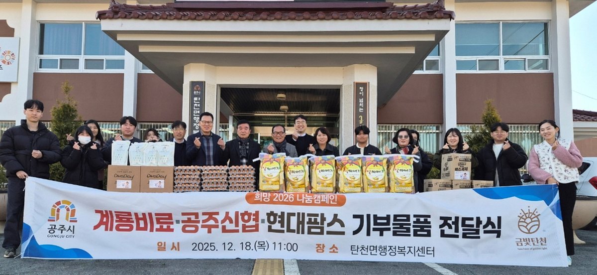 탄천면에 따르면, 공주신협, 계룡비료, 현대팜스㈜는 지난 18일 탄천면 행정복지센터를 방문해 쌀 36포, 세제 20상자, 달걀 100판을 기탁했다.