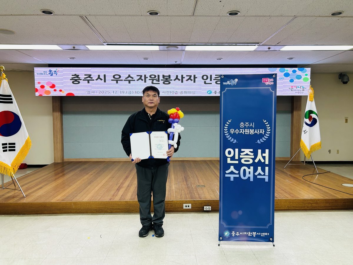 [충청중심뉴스] 현대엘리베이터 현대누리보듬봉사단 유성곤 단장은 지난 19일 시청 10층 중회의실에서 열린 충주시자원봉사센터 주관 ‘충주시 우수자원봉사자 인증서 수여식’에서 자원봉사 누적 3000시간 인증서와 인증뱃지를 수여받았다.