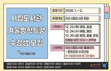 [충청중심뉴스] 아산시가 오는 23일부터 2026년 아산시립도서관 겨울방학 특강 수강생을 모집한다.