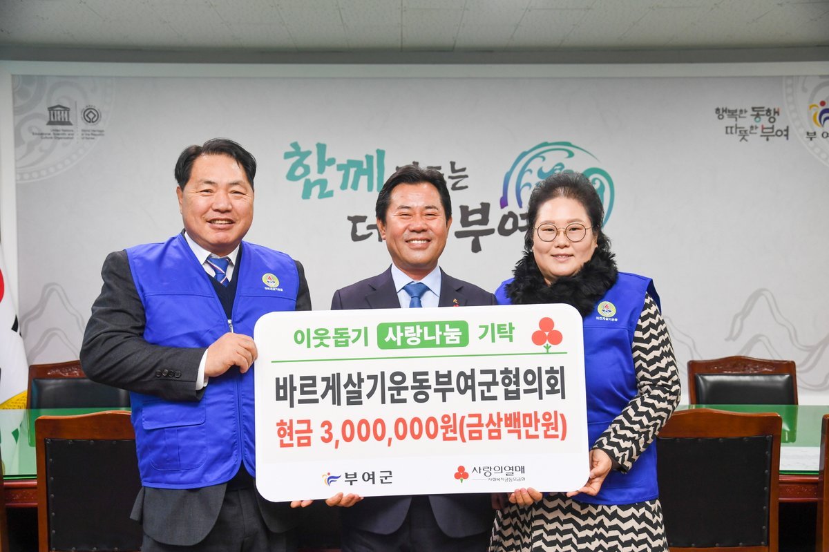 박정현 부여군수는 “경기가 어려운 상황임에도 불구하고 매년 잊지 않고 소중한 성금을 기탁해 주시는 바르게살기운동 부여군협의회에 진심으로 감사드린다.”라며, “전달해 주신 성금은 도움이 필요한 저소득 가구에 소중히 잘 전달하겠다.”라고 화답했다.