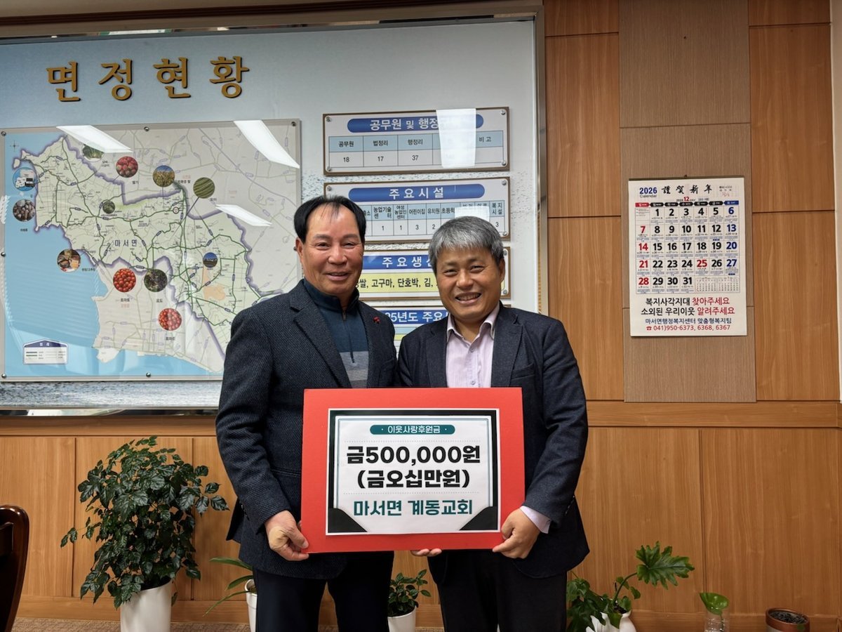 [충청중심뉴스] 서천군 마서면 계동교회가 지난 19일 마서사랑후원회에 후원금 50만원을 기탁하며 지역사회에 따뜻한 나눔을 실천했다.