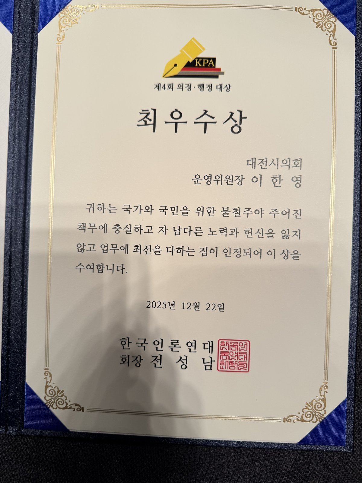 [충청중심뉴스] 대전시의회 이한영 운영위원장이 2025년 12월 22일 서울 프레스센터에서 열린‘제4회 의정·행정대상 시상식’에서 의정 부문 최우수상을 수상했다.