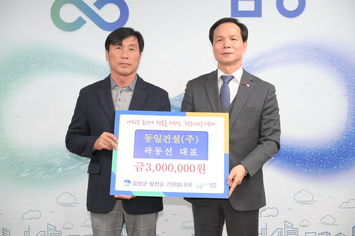 [충청중심뉴스] 음성군 소재의 동일건설㈜ 곽동선 대표가 지난 23일 음성군에 300만원의 고향사랑기부금을 전달했다.