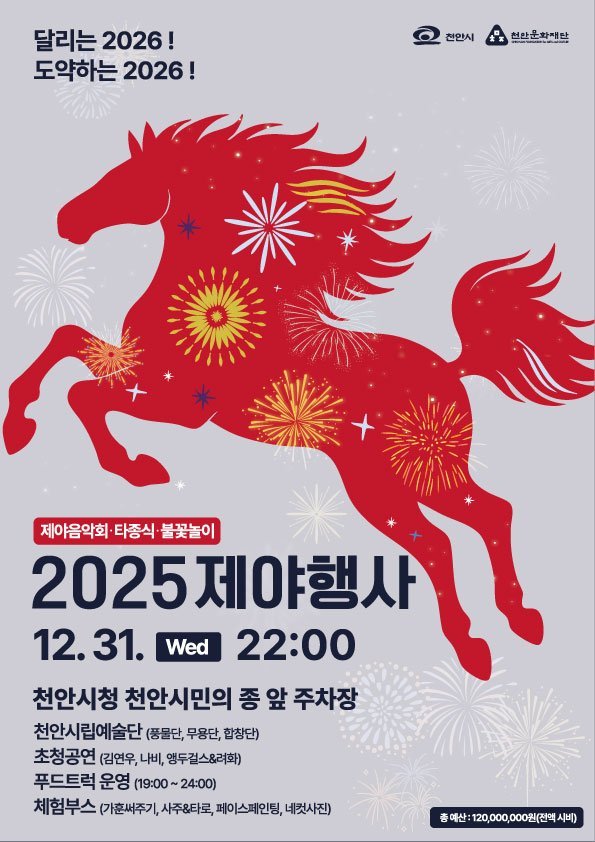 시는 8년 만에 시민들의 품으로 돌아온 천안시민의 종과 함께 ‘달리는 2026! 도약하는 2026! 2025 제야행사’를 진행한다. 오후 7시 지역예술인들의 공연을 시작으로 제야음악회와 타종식, 불꽃놀이가 이어질 예정이다.