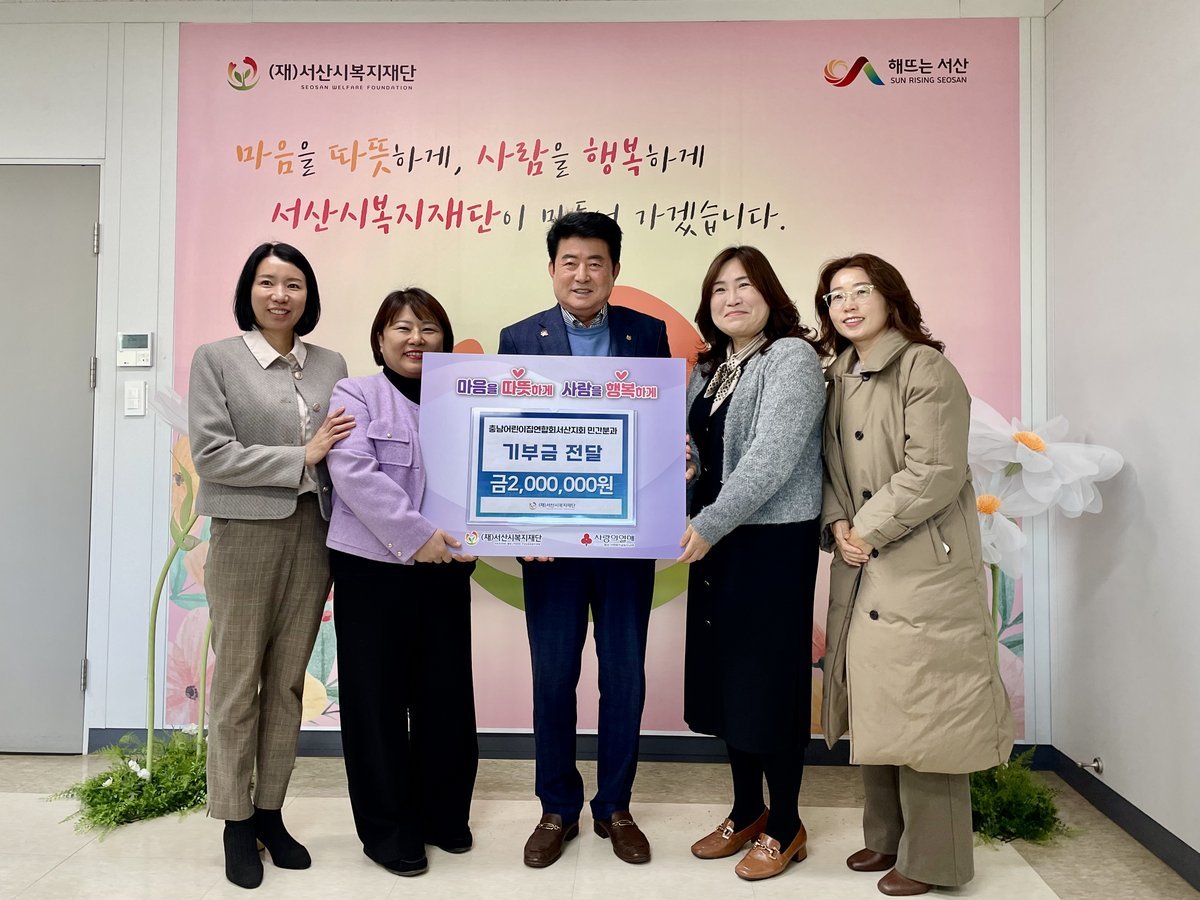 기부금은 민간분과 원장님들이 모은 기부금이며 이날 진행된 기탁식에는 서산시복지재단 장갑순 이사장과 충남어린이집연합회서산지회 민간분과장 이정숙, 금호어울림어린이집 원장 백효숙, 효성나라찬어린이집 원장 이현정, 대림어린이집 원장 이정순이 참석했다.