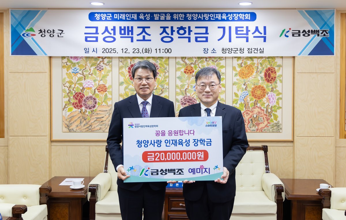 [충청중심뉴스] ㈜금성백조주택은 지난 23일 청양군청을 방문해 청양사랑인재육성장학회 김돈곤 이사장에게 지역 인재 육성을 위한 장학금 2천만 원을 기탁했다.