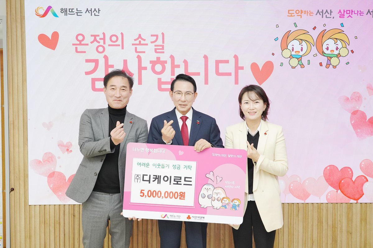 [충청중심뉴스] 충남 서산시는 24일 ㈜디케이로드가 관내 어려운 이웃을 돕기 위한 성금 500만 원을 기탁했다고 밝혔다.