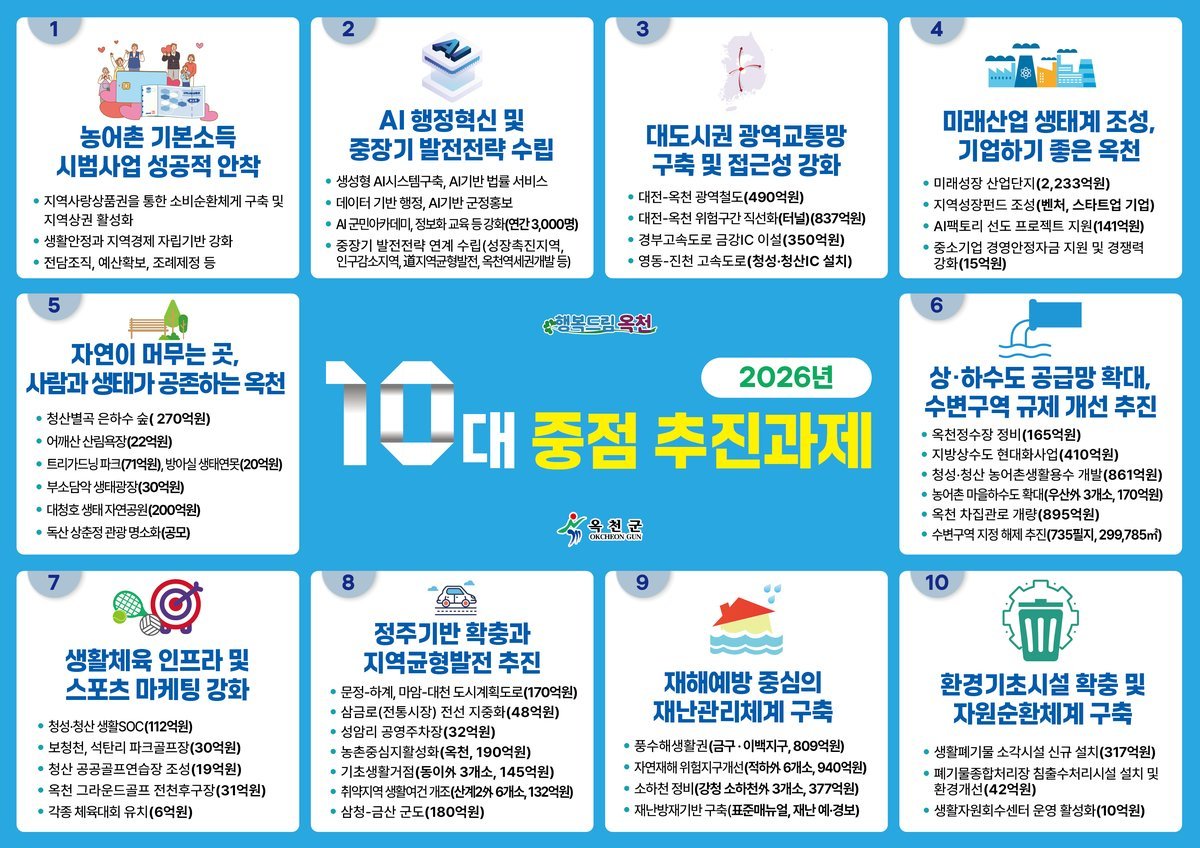 [충청중심뉴스] 옥천군이 26일 2026년 군정 운영의 핵심 방향을 담은 10대 중점 추진과제를 발표하고, 군민 삶의 질 향상과 지속가능한 지역성장을 위한 정책 추진에 나선다.