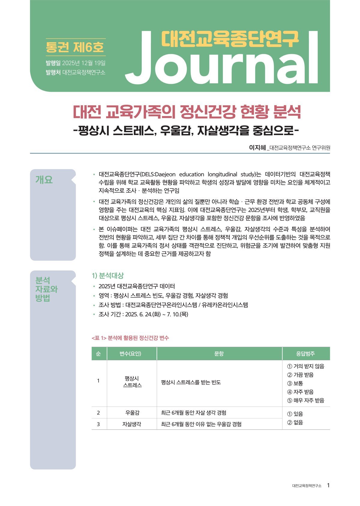 대전교육종단연구 저널 제6호「대전 교육가족의 정신건강 현황 분석」은 학생, 학부모, 교직원의 정신건강 관련 데이터를 활용하여, 평상시 스트레스, 우울감, 자살 생각 문항에 대해 학교급과 집단 간 평균 비교․차이 검증을 실행하였다.