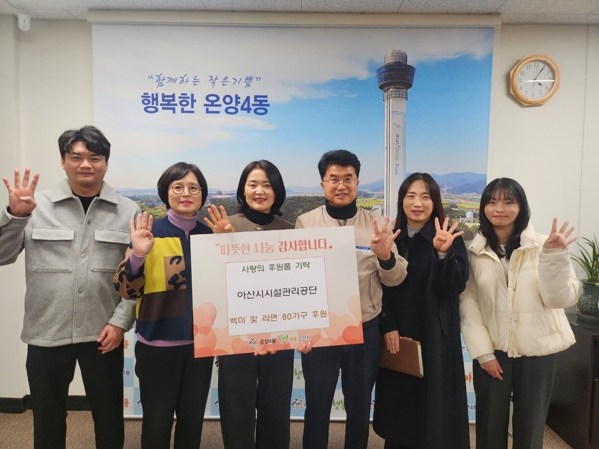 [충청중심뉴스] 아산시시설관리공단은 온양4동 행복키움추진단과 협력해 지난 26일 관내 저소득 취약계층 80가구에 백미와 라면을 기탁했다.