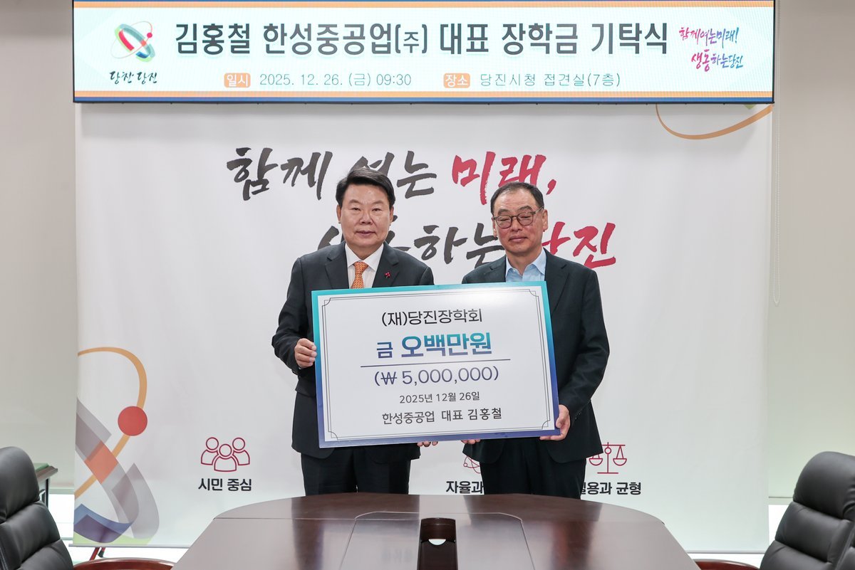 [충청중심뉴스] 당진장학회는 지난 26일 당진장학회 이사로 재임중인 김홍철 한성중공업㈜ 대표가 당진장학회에 장학금 500만 원을 기탁했다고 29일 밝혔다.